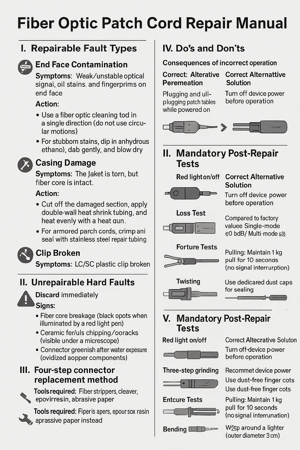 Odstraňování vlákna: Odřízněte poškozený konec a ponechejte alespoň 15 cm přebytečného vlákna. Odstraňte 3 cm vnější bundy a vyčistěte jádro vlákna pomocí otěrky alkoholu. Vlákno nový konektor. Vložte holé vlákno do nového keramického rukávu LC/SC. Vstřikujte modrou epoxidovou pryskyřici a léčba po dobu 30 minut. Přesné řezání: Pomocí samostatného vlákna svisle odstraňte přebytečné jádro vlákna. Průřez by měl vyčnívat ≤0,5 mm z rukávu. Leštění koncového obličeje