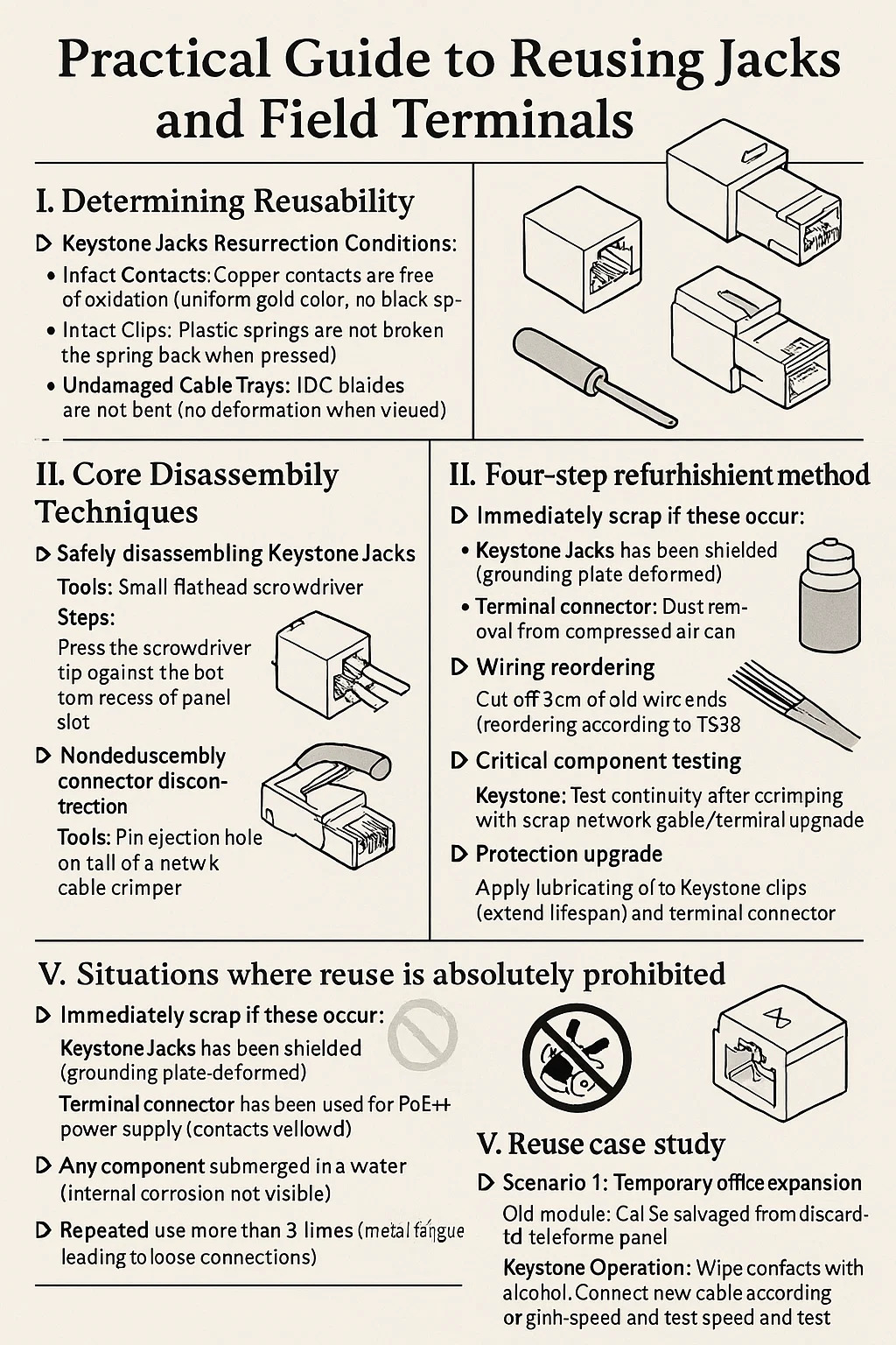 Starý modul: Cat5e zachráněný z vyřazeného telefonního panelu Keystone Operace: Otřete kontakty alkoholem. Připojte nový kabel podle původního barevného kódu. Připojte se k přepínači a otestujte rychlost; pokud splňuje požadavky, je připraven k použití.