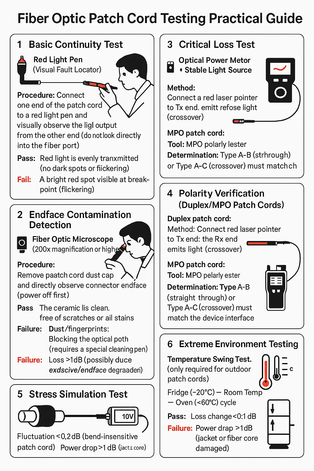 Pass: Fluktuace ≤0,2 dB (ohýbání necitlivá na náplast). Porucha: pokles napájení> 1dB (poškozené jádro nebo jádro vlákna).