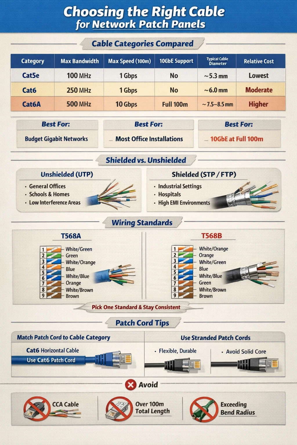 Když na to přijde síťové patch panely , Kabel Cat6 nestíněný kroucený pár (UTP) je nejčastěji doporučovanou a široce používanou volbou pro většinu podnikových a domácích síťových prostředí. Dosahuje správné rovnováhy mezi výkonem, náklady a zabezpečením do budoucna. To znamená, že nejlepší kabel pro vaše konkrétní nastavení propojovacího panelu závisí na vašich požadavcích na rychlost, délkách kabelů, podmínkách rušení a rozpočtu. Cat5e zůstává dokonale životaschopný pro gigabitové sítě s napjatým rozpočtem, zatímco Cat6A je volbou pro instalace 10GbE nebo datová centra s vysokou hustotou.