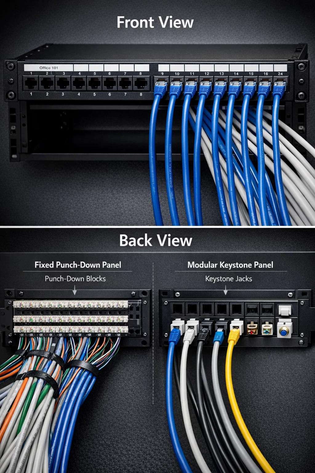 Pochopit vizuální identitu a síťový patch panel , je užitečné jej rozdělit na dvě odlišné strany: přední stranu směřující k uživateli a zadní stranu orientovanou na infrastrukturu.