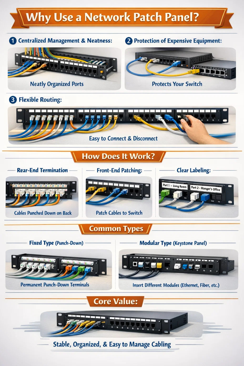 Představte si, že byste měli síťové kabely z 20 místností přímo připojené k přepínači; kdyby se kabely zamotaly, byl by to průšvih. Díky síťovému propojovacímu panelu jsou všechny dlouhé kabely vycházející ze stěn úhledně připevněny k zadní části panelu, zatímco přední strana má řadu úhledně uspořádaných portů.