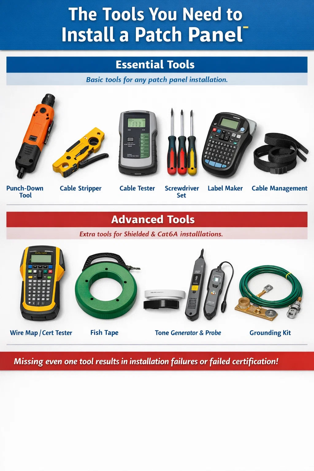 Chcete-li nainstalovat a síťový patch panel , potřebujete děrovací nástroj, odizolovač kabelů, tester kabelů, sadu šroubováků, štítkovač a řešení pro správu kabelů, jako jsou pásky na suchý zip nebo stahovací pásky. Pro náročnější instalace – zejména Cat6A nebo stíněnou kabeláž – budete také chtít tester map vodičů nebo tester plné certifikace, rybí pásku nebo kabelovou tažnou rukojeť a tónový generátor se sondou. Nejedná se o volitelné doplňky. Chybějící byť jen jeden z nich má za následek buď selhání instalace, necertifikovaný kanál nebo problém s údržbou, který se objeví po měsících.