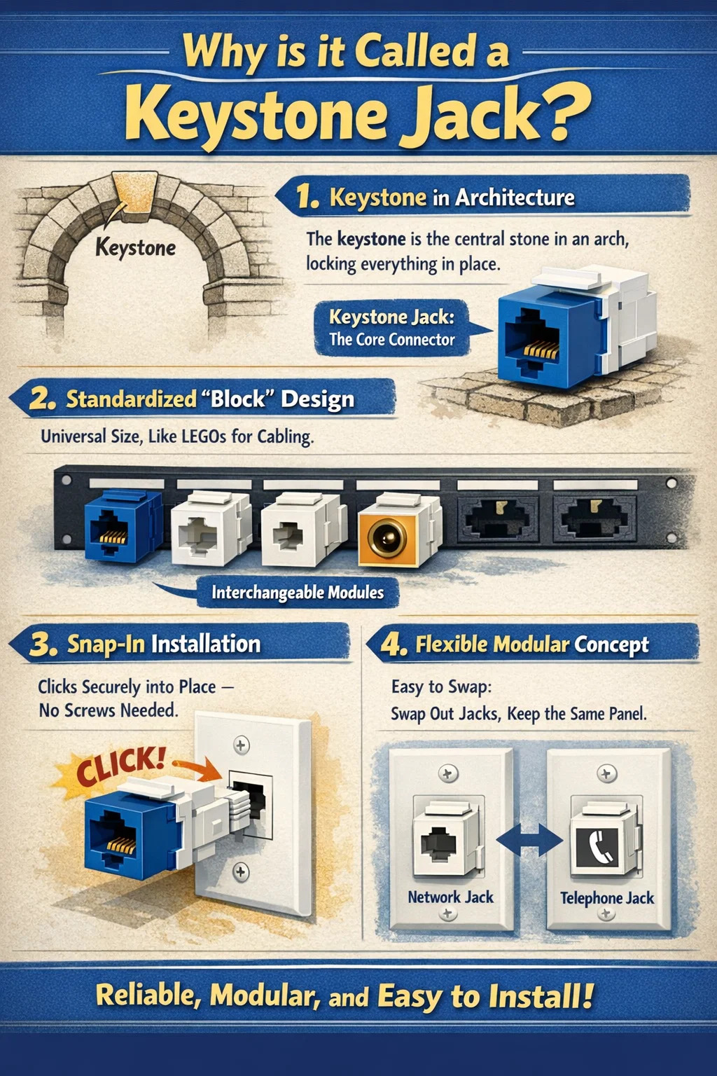 Síťové produkty si tento termín vypůjčily hlavně proto, že Keystone Jack hraje podobnou roli v modulárních kabelážních systémech: